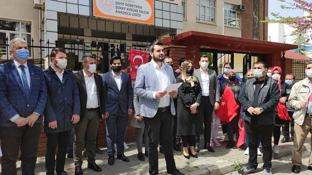 AK Parti Balıkesir İl Gençlik Kolları Başkan Vekili Gökhan Tanaydın, Edremit Gençlik Kolları Başkanı Ali Armağan Çakan ile birlikte, Şehit Öğretmen Şenay Aybüke Yalçın Anadolu Lisesi önünde basın açıklaması yaptı. Edremit’te Şehit Öğretmen Şenay Aybüke Yalçın’ın ismini taşıyan okul önünde bir araya gelen AK Parti Balıkesir Gençlik Kolları temsilcileri bir basın bildirisi ile şehidin ismine karşı yaşanan saygısızlığa tepki gösterdiler.