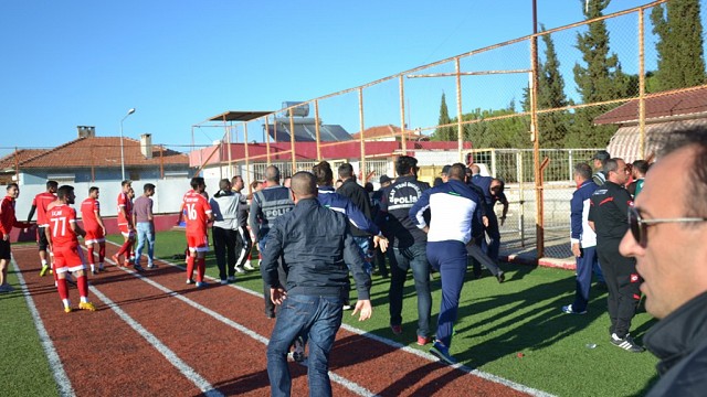 Balıkesir’in Ayvalık ilçesinde, Bölgesel Amatör Lig 9. Grup'ta mücadele eden Ayvalıkgücü Beleidyespor saha ve seyircisi önünde İzmir’in Bornova Yeşilovaspor takımıyla karşılaştı. 0-0 berabere biten mücadele sonrasında soyunma odasına giderken iki takım oyuncuları arasında sözle başlayan tartışma arbedeye dönüştü. Bornova Yeşilovasporlu iki oyuncunun Ayvalıkgücü Belediyesporlu futbolculara saldırmasıyla her iki takımın oyuncuları tekme-tokat birbirine girdi. Ayvalık İlçe Emniyet Müdürlüğü bünyesindeki kalabalık ekibin müdahalesiyle güçlükle ayrılan oyuncuların ardından, bu kez Bornova Yelşilovaspor taraftarı sahadaki bulunan kırmızı-beyazlı takımın oyuncu, teknik kadrosunu taş yağmuruna tuttu. Bunu gören Ayvalıkgücü Belediyespor taraftarı da müdahale etmek isteyince Bornova Yeşilova Spor taraftarı kırmızı-beyazlı tribünlere de taş yağdırdı. Karşılaşmayı izleyen Ayvalık Kaymakamı Gökhan Görgülüaslan’ın yanı sıra Ayvalık Belediye Başkanı Rahmi Gençer, İlçe Emniyet Müdürü Fikret Bakır, İlçe Jandarma Komutanı Özay Dörttepe ve İlçe Gençlik Hizmetleri Spor Müdürü Cem Hamzaoğlu’nun da telkinleriyle kavga yatıştırılmaya çalışıldı. Arbede Bornova Yeşilovasporlu taraftarın polis tarafından tribünlerden uzaklaştırılmasıyla sona erdi. (İHA)