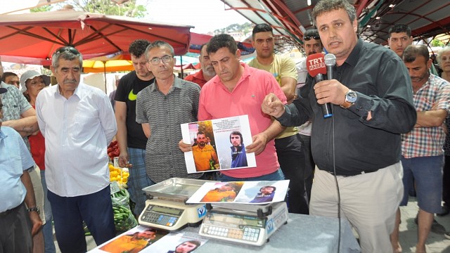 Ayvalık Pazarcılar Odası Yönetim Kurulu geçtiğimiz günlerde Ayvalık’ta iki gencin uyuşturucu yüzünden hayatını kaybetmesinin ardından İlçede oluşan büyük üzüntü ve tepkiye ortak olarak uyuşturucu kullanımına dikkat çekmek için bir eylem düzenleyip basın açıklaması yaptılar. Ayvalık Perşembe pazarında saat 12.00 da yapılan eylemde Pazar da tezgah açan pazarcılar 5 Dakika terazilerini kapatarak alış veriş yapmadılar. Ayvalık Pazarcılar Odasının bu duyarlılığına pazarda alış veriş yapan vatandaşlarda destek vererek eyleme alkışlarıyla eşlik ettiler. Ayvalık Pazarcılar Odası Başkanı Elmas Özmen konu ile ilgili yönetim kurulu adına basın açıklamasını Pazarcılar Odası önünde pazarcı esnafı ve vatandaşların arasında yaptı. “DEVLET BU UYUŞTURUCUNUN ÖNÜNE GEÇEBİLİR” Özmen, “Ayvalık’ta iki gencimizi toprağa verdik.Uyuşturucu yüzünden.Su Testisi Su yolunda Kırılır dedikleri çocuklardan değiller. Pırıl Pırıl çocuklardı,arkadaş kurbanı oldular.Bunlar hepimizin çocuğu,bizimde çocuklarımız var.Hepimizin başına gelebilir.O yüzden Emniyeti STK’ları,Halkı ve Devleti Göreve davet ediyoruz.Devlet bu uyuşturucunun önüne geçebilir. Uyuşturucuyu Bonzai olsun,esrar olsun önüne geçip bu gençleri kurtarmasını istiyoruz. Bir tane ağaç kesiliyor çevreciler ayağa kalkıyor.Bir köpek öldürülüyor veya ölüyor ana haberlereçıkıyor herkes. Bu çevreciler bu hayvan severler bir insan için neden ayağa kalkmıyorlar.Dün tabuta sığdıramadık bu çocukları. Bunlar 21 yaşında ömürlerinde sigara içmemiş çocuklar.Bir arkadaş ortamında zehirlendiler.İki cenazeye gittik.İki aileyi gördükten sonra hayattan soğuyorsunuz anne baba bitmiş durumda. Geçen yıl bizim burada oturan Ali isminde bir çocuk uyuşturucuya kurban verdik. Ne oldu hiç bir şey olmadı. Çocuk öldüğü ile kaldı. Uyuşturucu satanlar satmaya devam ediyor.Alanlar almaya devam ediyor,içen içmeye devam ediyor Ali gittiği ile kaldı acısı annesine babasına dert oldu.”dedi. Haber ve fotoğraf: Ali İhsan UYSAL