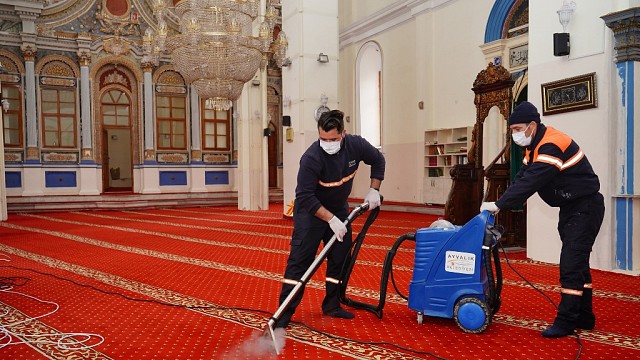 Ayvalık Belediyesi, kent genelindeki camilerde Ramazan ayı öncesi dezenfeksiyon ve temizlik çalışmalarını gerçekleştiriyor. Cami, cemevi ve mescit gibi ibadethanelerin detaylı temizlik-dezenfeksiyon çalışmaları Ayvalık Belediyesi Temizlik İşleri Müdürlüğü ekipleri tarafından büyük bir titizlikle yürütülüyor. Ayvalık Belediye Başkanı Mesut Ergin, Ramazan ayı süresince ekiplerin temizlik ve dezenfeksiyon çalışmalarını düzenli olarak sürdüreceklerini söyledi.