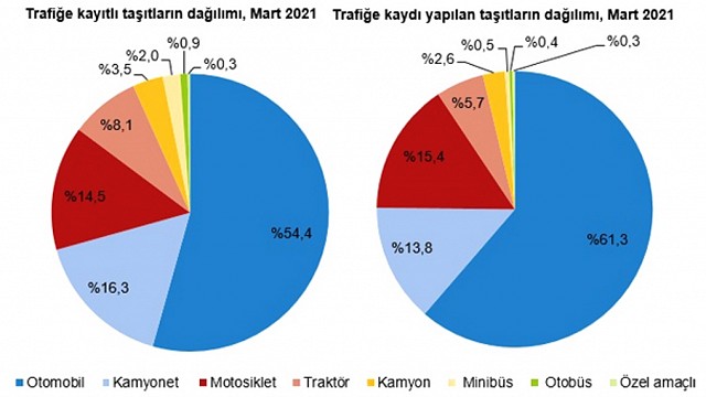 TÜİK Balıkesir Bölge Müdürlüğünden alınan bilgilere göre; Ülkemizde Mart ayında 130 bin 420 adet taşıtın trafiğe kaydı yapıldı. Balıkesir’de trafiğe kayıtlı taşıt sayısı Mart ayı sonu itibarıyla 506 109 oldu. Çanakkale’de trafiğe kayıtlı taşıt sayısı Mart ayı sonu itibarıyla 241 536 oldu. TÜİK Balıkesir Bölge Müdürlüğünden alınan bilgilere göre; Mart ayında trafiğe kaydı yapılan taşıtların %61,3'ünü otomobil, %15,4'ünü motosiklet, %13,8'ini kamyonet, %5,7'sini traktör, %2,6'sını kamyon, %0,5'ini minibüs, %0,4'ünü otobüs ve %0,3'ünü özel amaçlı taşıtlar oluşturdu. Trafiğe kaydı yapılan taşıt sayısı bir önceki aya göre %71,8 arttı Mart ayında trafiğe kaydı yapılan taşıt sayısı bir önceki aya göre minibüste %117,8, otomobilde %87,2, motosiklette %61,0, özel amaçlı taşıtlarda %56,4, kamyonette %52,7, kamyonda %47,3, otobüste %34,2 ve traktörde %30,0 arttı. Trafiğe kaydı yapılan taşıt sayısı geçen yılın aynı ayına göre %81,0 arttı Mart ayında trafiğe kaydı yapılan taşıt sayısı geçen yılın aynı ayına göre özel amaçlı taşıtlarda %183,5, kamyonda %134,2, kamyonette %86,6, otomobilde %84,8, traktörde %74,7, motosiklette %67,4 artarken, minibüste %15,6 ve otobüste %9,5 azaldı. Trafiğe kayıtlı toplam taşıt sayısı Mart ayı sonu itibarıyla 24 milyon 454 bin 396 oldu Mart ayı sonu itibarıyla trafiğe kayıtlı taşıtların %54,4'ünü otomobil, %16,3'ünü kamyonet, %14,5'ini motosiklet, %8,1'ini traktör, %3,5'ini kamyon, %2,0'ını minibüs, %0,9'unu otobüs ve %0,3'ünü özel amaçlı taşıtlar oluşturdu. Mart ayında 690 bin 994 adet taşıtın devri yapıldı Mart ayında devri(1) yapılan taşıtların %65,4'ünü otomobil, %17,7'sini kamyonet, %6,2'sini motosiklet, %4,2'sini traktör, %3,2'sini kamyon, %2,4'ünü minibüs, %0,7'sini otobüs ve %0,2'sini özel amaçlı taşıtlar oluşturdu. Mart ayında 80 bin 2 adet otomobilin trafiğe kaydı yapıldı Mart ayında trafiğe kaydı yapılan otomobillerin %13,9'u Fiat, %11,4'ü Renault, %11,3'ü Volkswagen, %9,4'ü Toyota, %5,9'u Skoda, %5,7'si Hyundai, %4,9'u Peugeot, %4,3'ü Honda, %3,5'i Dacia, %3,3'ü Kia, %3,3'ü Citroen, %3,1'i Nissan, %3,0'ı Mercedes-Benz, %3,0'ı Opel, %2,7'si Ford, %2,4'ü BMW, %2,4'ü Seat, %2,3'ü Audi, %1,1'i Volvo, %0,5'i Land Rover ve %2,6'sı diğer markalardan oluştu. Ocak-Mart döneminde 323 bin 635 adet taşıtın trafiğe kaydı yapıldı Ocak-Mart döneminde bir önceki yılın aynı dönemine göre trafiğe kaydı yapılan taşıt sayısı %47,3 artarak 323 bin 635 adet olurken, trafikten kaydı silinen taşıt sayısı %15,2 azalarak 11 bin 836 adet oldu. Böylece Ocak-Mart döneminde trafikteki toplam taşıt sayısında 311 bin 799 adet artış gerçekleşti. Ocak-Mart döneminde trafiğe kaydı yapılan otomobillerin %57,8'i benzin yakıtlıdır Ocak-Mart döneminde trafiğe kaydı yapılan 197 bin 236 adet otomobilin %57,8'i benzin, %29,6'sı dizel, %7,3'ü elektrikli veya hibrit olup %5,3'ü LPG yakıtlıdır. Mart ayı sonu itibarıyla trafiğe kayıtlı 13 milyon 293 bin 727 adet otomobilin ise %38,2'si dizel, %36,4'ü LPG, %24,8'i benzin yakıtlı olup, %0,4'ü elektrikli veya hibrittir. Yakıt türü bilinmeyen(2) otomobillerin oranı ise %0,3'tür. Ocak-Mart döneminde en fazla 1401-1500 silindir hacimli otomobil kaydı yapıldı Ocak-Mart döneminde trafiğe kaydı yapılan 197 bin 236 adet otomobilin %30,4'ü 1401-1500, %26,7'si 1300 ve altı, %18,5'i 1301-1400, %17,6'sı 1501-1600, %5,8'i 1601-2000, %0,7'si 2001 ve üstü motor silindir hacmine sahiptir. Ocak-Mart döneminde kaydı yapılan otomobillerin 79 bin 116'sı beyaz renklidir Ocak-Mart döneminde trafiğe kaydı yapılan 197 bin 236 adet otomobilin %40,1'i beyaz, %28,7'si gri, %10,3'ü mavi, %7,6'sı kırmızı, %6,6'sı siyah, %2,2'si turuncu, %1,4'ü kahverengi, %0,6'sı sarı, %0,4'ü yeşil renkli iken %2,2'si diğer renklerdedir. AÇIKLAMALAR (1) Devir, noterler aracılığı ile bir veya daha fazla el değiştiren taşıtları ifade etmektedir. (2) Yakıt türü bilinmeyenler, ruhsat işlemlerinde yakıt türü boş bırakılan veya sehven hatalı veri girişi yapılan otomobilleri kapsamaktadır. Haber: Aydın DEMİRKAYA