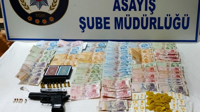 Düzenlenen operasyonda oyun masası üzerinden ve şahıslardan toplam, (6.765) TL para, para yerine geçen muhtelif renklerde (93) pul, (13) adet okey taşı, (2) deste iskambil kağıdı, (1) adet çetele bulundu. Şüphelilerden M. B.'nin üzerinde (1) adet ruhsatsız tabanca, (9) adet fişek ile (1) adet kapsam dışı bıçak ele geçirildi. İkamet içerisinde yapılan aramada ise (2) adet uyuşturucu kullanmak için özel olarak yapılmış kova olarak tabir edilen düzenek, (5) adet uyuşturucu hap ve bir miktar kenevir tohumu elde edilerek muhafaza altına alınmıştır.