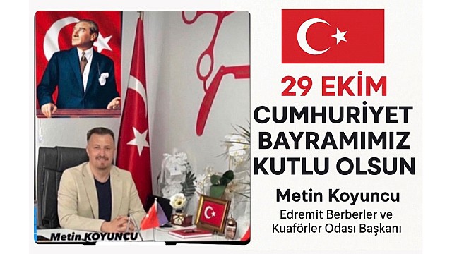 Edremit Berberler ve Kuaförler Odası Başkanı Metin Koyuncu, 29 Ekim Cumhuriyet Bayramı dolayısıyla bir mesaj yayınladı. Edremit Berberler ve Kuaförler Odası Başkanı Metin Koyuncu mesajında, “Gazi Mustafa Kemal Atatürk’ün “En büyük eserim” diyerek bizlere emanet ettiği Cumhuriyetimizin 102. yıl dönümünü, büyük bir gurur ve coşkuyla kutluyoruz. Cumhuriyet; eşitliğin, özgürlüğün, kardeşliğin ve millet iradesinin simgesidir. Bu değerleri yaşatmak, gelecek nesillere güçlü bir Türkiye bırakmak hepimizin görevidir. Başta Gazi Mustafa Kemal Atatürk ve silah arkadaşları olmak üzere, bu toprakları bizlere vatan kılan tüm kahramanlarımızı rahmet, minnet ve saygıyla anıyoruz.” Dedi. Haber: Hasan AKAR