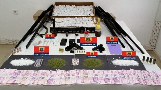 Jandarmanın emniyet, asayiş ve kamu düzeninin sağlanmasına yönelik çalışmaları aralıksız olarak devam ediyor. Balıkesir İl Jandarma Komutanlığınca, uyuşturucu madde imal ve ticaretine yönelik yapılan istihbari çalışmalar neticesinde, Bigadiç İlçesinde örgütlü olarak uyuşturucu madde ticareti yaptığı tespit edilen (12) şüphelinin ikamet adreslerinde yapılan aramalarda; (260) gram metamfetamin, (140) gram kubar esrar, (186) adet sentetik uyuşturucu hap, (18) adet uyuşturucu kullanma aparatı, (1) adet hassas terazi, (3) adet tabanca, (6) adet av tüfeği, (25) adet fişek, (18.000) adet dolu makaron, suçtan elde edildiği değerlendirilen (9.810) TL, (1) adet dron ve yaka kamerası ele geçirildi. Olayla ilgili (12) şüpheli yakalanarak gözaltına alındı. Haber: Aydın DEMİRKAYA