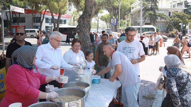 Burhaniye Belediyesi’nin her sene geleneksel olarak düzenlediği aşure hayrı Belediye hizmet binası önünde yapıldı. 3 ayrı noktada yapılan dağıtımda, Belediye Başkanı Ali Kemal Deveciler, Belediye Başkan Yardımcıları Tamer Midilli, Ayten Tuna ve Burhaniye Belediye Meclis Üyesi Muharrem Keskün vatandaşlara aşure ikramlarında bulundu. Burhaniye Belediyesi aşevinde aşçılar tarafından hazırlanarak vatandaşlara ikram edilen aşure dağıtımının ardından konuşan Burhaniye Belediye Başkanı Ali Kemal Deveciler “Bugün bu güzel ortamda birlik ve beraberliğin en güzel örneğini hep beraber yaşıyoruz. Birçok çeşidin bir araya gelmesiyle oluşan aşure, bizlere farklılıklarımızla yaşamayı anlatıyor. Bu yüzden bugünün anlamı çok değerlidir. Hayrımız mübarek olsun” dedi.