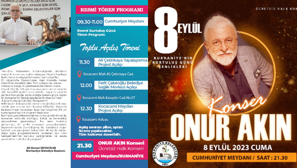 Resmi tören ve toplu açılış törenleri ile başlayan 8 Eylül Burhaniye’nin Kurtuluşu Etkinlikleri akşam 21.30’da düzenlenecek Onur Akın konseri ile son bulacak. “Milletimizin kahramanlık destanı sergilediği milli mücadele ana unsuru olan Kuva-yı Milliye’nin başkenti Balıkesir’imizin kahraman ilçesi Burhaniye’nin kurtuluşunun 101. Yılına özel bir program hazırladık” diyen Belediye Başkanı Ali Kemal Deveciler, tüm vatandaşları birlik ve beraberlik duygularını pekiştirme gayesi ile kurtuluş şenliğine davet etti.