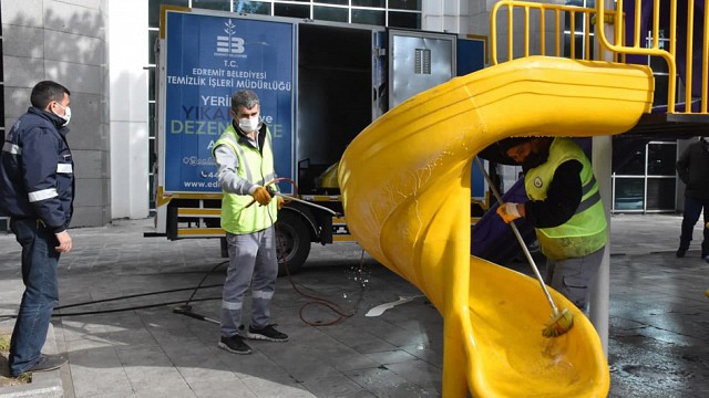 Edremit Belediyesi Park ve Bahçeler Müdürlüğü ekipleri şehir genelinde temizlik ve dezenfeksiyon çalışmalarına devam ediyor. Edremit Belediyesi ekipleri kent genelinde yoğunluğun fazla olduğu park ve meydanlarda dezenfeksiyon çalışmalarını rutin olarak sürdürüyor. Faruk Serpil Parkı’ndaki oturma alanları ve oyun grupları, spor aletleri gibi sık kullanılan alanları dezenfekte eden ekipler, pandemi dolayısıyla hijyen çalışmalarına iki kat özen gösteriyor. Yıkama, temizleme ve dezenfeksiyon çalışmaları kent genelindeki sık kullanılan tüm alanlarda devam edilecek.
