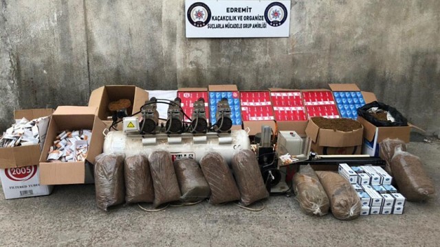 Balıkesir Valiliği’nden yapılan basın açıklamasında şöyle denildi: Elde edilen istihbari bilgi üzerine polis ekipleri adli makamlardan alınan arama kararına istinaden K.K.'ye ait ikamette yapılan aramada; 5 bin 60 adet dolu makaron, 85 kilogram açık tütün, 70 bin 200 adet TAPDK bandrolü bulunmayan boş makaron, 74 kg kıyılmış tütün, 50 bin adet sigara paketlemede kullanılan şeffaf poşet, 8 adet elektronik sigara sarma makinesi ve 6 paket nargile tütünü ele geçirildi. Operasyonda yakalanan makaron ve tütünler muhafaza altına alınırken, şüpheliler hakkında yasal işlem başlatıldı. Kamuoyuna saygı ile duyurulur.
