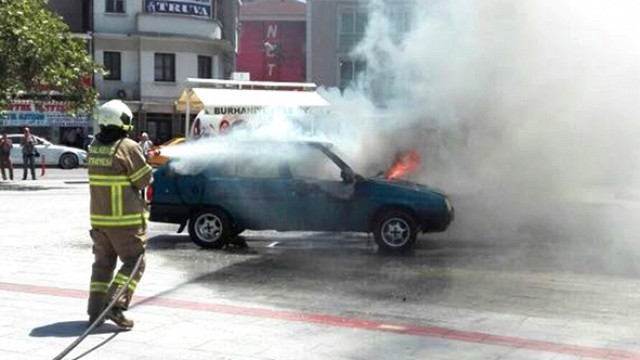 Balıkesir'in Burhaniye ilçesinde park halindeki bir araç alev alev yandı. Edinilen bilgiye göre, öğle saatlerinde 06 FHY 86 plakalı otomobili ile Cumhuriyet Meydanı'na gelen İ.D, aracını meydanın ortasına park etti. Bir süre sonra aracın yandığını gören vatandaşlar itfaiyeye haber verdi. Kısa sürede yangın yerine gelen itfaiye ekipleri alevler içinde kalan otomobili söndürdü. Araçta büyük maddi hasar meydana geldi. Olayla alakalı tahkikat başlatıldı. (İHA)