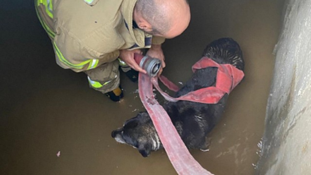 Kanalizasyona düşen köpeği İtfaiye ekipleri kurtardı