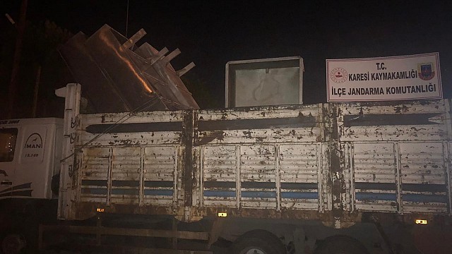 Balıkesir'de Köteyli mahallesinde kapalı süt tesisinden hırsızlık yapan zanlıları jandarma ekipleri suçüstü yakaladı. Hırsızlık zanlısı 4 kişi tutuklanarak, cezaevine gönderildi. Edinilen bilgiye göre, Karesi ilçesi Köteyli mahallesinde bulunan ve kapalı durumda bulunan Süt tesislerinden hırsızlık yapıldığına dair alınan bir ihbar üzerine Karesi İlçe Jandarma Komutanlığından görevlendirilen devriyeler süratle anılan bölgeye intikal etmiştir. Görevli jandarma devriyeleri tarafından işyeri ve çevresinde yapılan kontrol sırasında E.O., Y.Y., K.F. ve A.G. isimli şahıslar, işyerinden çaldıkları 2 adet süt kazanı ve 10 adet peynir üretim kazanını 10 plakalı araca yükledikleri esnada suçüstü yakalandı. Bu olayla ilgili olarak Cumhuriyet Savcısının talimatıyla gözaltına alınan E.O., Y.Y., K.F. ve A.G. isimli şüpheliler sevk edildiği Adli makamlarca tutuklanarak Kepsut Cezaevine teslim edildi. Hırsızlık olayında kullanılan 10 plakalı araç ile içerisinde ele geçirilen çalıntı malzemeler muhafaza altına alındı. (İHA)