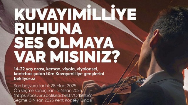 Kuvayımilliye Gençlik Orkestrası’nda yer almak isteyen gençler, https://basvuru.balikesir.bel.tr/Orkestra linkinde yer alan formu doldurarak 28 Mart 2025 Cuma gününe kadar ön seçme için başvuru yapabilecekler. “Ön Seçme” ve “Seçme” olarak iki aşamadan oluşan başvurunun tamamlanabilmesi için gençler enstrümanlarıyla kısa bir video hazırlayacak. Temel teknik becerilerin değerlendirileceği bu video kaydının en az 3 en fazla 5 dakika olması gerekiyor. Kaydın temiz ve eksiksiz olarak duyulduğu video wetransfer.com adresine yüklenip bu link de başvuru formundaki ilgili yere yapıştırılıp başvuru tamamlanacak. Ön seçme sonuçları ise 2 Nisan 2025 Çarşamba günü https://www.balikesirkentkonseyi.org/ adresinden açıklanacak.