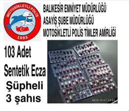 Balıkesir'de motosikletli tim polisleri 3 zehir tacirine operasyon düzenledi. Edinilen bilgiye göre, Balıkesir'de asayiş uygulaması yapan Motosikletli Polis Timleri Büro Amirliği'ne bağlı ekipler şüphe üzerine 3 kişinin üst aramasını yaptı. Polis ekipleri üst araması yaptıkları S.E., B.Ç. VE Ö.Ç' nin üzerinden 103 adet uyuşturucu hap ele geçirdi. Polisler gözaltına alınan S.E., B.Ç. ve Ö.Ç. Kuva-yi Milliye Polis Merkezi Amirliği'ne teslim edildi. Olayla ilgili soruşturma devam etiği öğrenildi. (İHA)