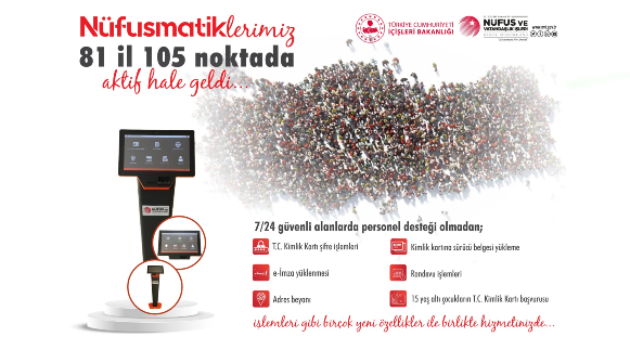 İçişleri Bakanlığı Nüfus ve Vatandaşlık İşleri Genel Müdürlüğü tarafından nüfus müdürlüklerinin iş yükünü azaltmak ve vatandaşlarımızın işlemlerini kolaylaştırmak amacıyla hayata geçirilen Nüfusmatikler ülke genelinde yaygınlaştırılarak 81 ilde 105 noktada hizmet vermeye başladı. Bakanlığın mühendisleri tarafından tamamen yerli ve milli yazılım ile geliştirilen ve 10 Ocak tarihinde 50 ildeki nüfus müdürlüklerinde hizmet vermeye başlayan Nüfusmatik uygulaması, ülke genelinde yaygınlaştırıldı. 81 ilde 105 noktada hizmet vermeye başlayan Nüfusmatikler ile nüfus müdürlüklerinin iş yükü azaltılırken, vatandaşlarımız işlemelerini daha kolay yapabilecek. Bir Ayda 10 Bini Aşkın Kişi İşlem Yaptı İlk etapta 50 ilde faaliyete başlayan nüfusmatiklerden, bir ayda 10 bini aşkın kişi işlem gerçekleştirdi. Türkiye Cumhuriyeti kimlik kartı sahibi olan vatandaşlarımız Nüfusmatikte yer alan parmak izi cihazı ile kimlik doğrulaması yaptıktan sonra; Kimlik Kartı İşlemleri (Bilgi Görüntüleme, Pin, Kişisel Mesaj değiştirme vb.) Adres Beyanı, Kimlik Kartı Başvurusu, 15 Yaş Altı Çocukların Ebeveynleri Tarafından Kimlik Kartı Başvurusu, Kimlik Kartına e-imza Yükleme, Kimlik Kartına Sürücü Belgesi Yükleme, Randevu işlemlerini gerçekleştirebiliyor. Nüfusu 50 binin üzerinde olan muhtarlıklarda, havalimanlarında, belediyelerde ve Cumhurbaşkanlığı Millet Kütüphanesi’nde nüfusmatiklerin yer almasına ilişkin planlamalar ise devam ediyor.