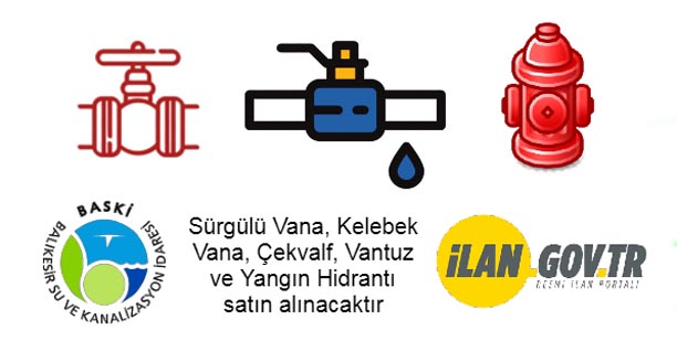 Balıkesir Su ve Kanalizasyon Genel Müdürlüğü (BASKİ) Ticaret İşleri Dairesi Başkanlığı tarafından Sürgülü Vana, Kelebek Vana, Çekvalf, Vantuz ve Yangın Hidrantı satın alınacaktır.
