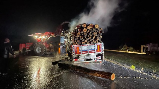 Tomruk yüklü Tır yangınına İtfaiye müdahale etti
