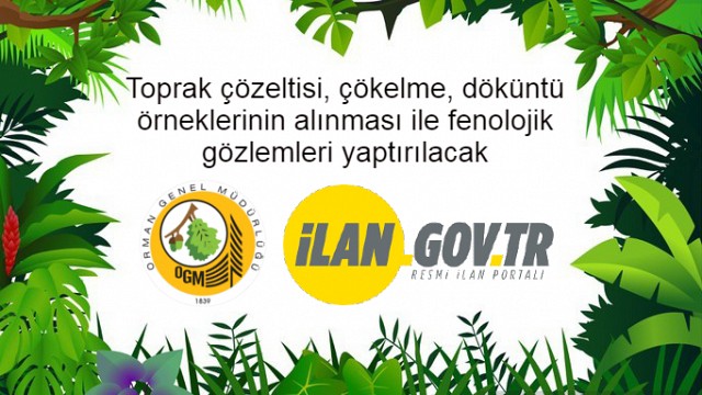 Dursunbey Orman İşletme Müdürlüğü tarafından; Çökelme, Döküntü, Toprak çözeltisi kapanlarında biriken örneklerin toplanması ile fenolojik gözlemlerin yapılması, arazi karnelerinin doldurulması, karne içeriği verilerin veri tabanına girilmesi, toplanan örneklerin laboratuvara gönderilmesi İşi hizmet alımı 4734 sayılı Kamu İhale Kanununun 19 uncu maddesine göre açık ihale usulü ile ihale edilecek olup, teklifler sadece elektronik ortamda EKAP üzerinden alınacaktır. İhale; 24 Ocak 2022 tarihinde Saat: 14.30’da Dursunbey Orman İşlt. Müdürlüğü Bozyokuş Mah. İsmail Dayı Cad. No:68 Kat:1 10800 Dursunbey / BALIKESİR adresinde yapılacaktır. Detaylı bilgi için tıklayınız