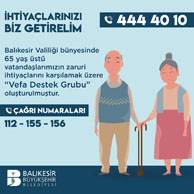 Balıkesir Büyükşehir Belediyesinden yapılan basın açıklamasında şöyle denildi: Aramanız yeterli! 65 yaş üstü kıymetli büyüklerimiz; Vefa Destek Grubu, zaruri ihtiyaçlarınızı karşılıyor. Aşağıdaki numaralardan ekiplerimize ulaşabilirsiniz. 444 40 10 Çağrı Merkezi: 112- 155- 156 Haber: Aydın DEMİRKAYA