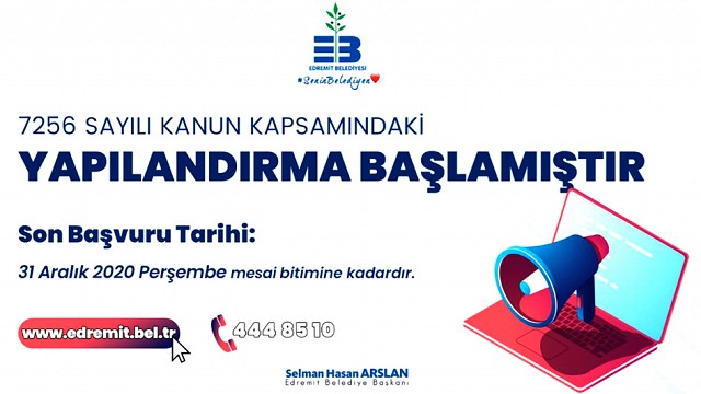 07.11.2020 tarihli ve 31307 sayılı Resmi Gazete’de yayımlanan 7256 sayılı ‘Bazı Alacakların Yeniden Yapılandırılması ile Bazı Kanunlarda Değişiklik Yapılması Hakkında Kanun’ kapsamında emlak, çevre temizlik, ilan ve reklam vergileri, yasanın öngördüğü diğer vergi ve para cezaları, 213 sayılı Kanun kapsamındaki alacaklar ile 6183 sayılı Kanun kapsamındaki alacaklar yeniden yapılandırılıyor. İnternet üzerinden başvuru vatandaş için büyük kolaylık sağladı Yapılandırmanın yürürlüğe girmesi ile Edremit Belediyesi Bilgi İşlem Müdürlüğü gerekli yazılım alt yapılarını tamamlayıp internet üzerinden başvuru alınmaya başladı. Başvuruların yüzde 45’i internet üzerinden yapılırken, özellikle pandemi sürecinde evlerinden çıkmak istemeyen vatandaşlar tarafından memnuniyetle karşılandı.