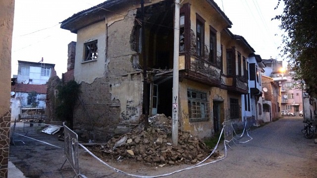 Balıkesir’in Edremit ilçesi Kapıcıbaşı Mahallesi Gaziilyas Caddesinde bulunan tarihi yapının duvarlarında yıkılmalar olması ve sesler gelmesi üzerine vatandaşlar Edremit Belediyesi Zabıta ekiplerine haber verdi. Tarihi yapının üst çatı kısmının beton elektrik direğine yaslanarak ayakta kaldığının görülmesi üzerine, zabıta ekipleri tarafından çevre güvenliği alındı. Yıkılma tehlikesi bulunan ev tahliye edildi. UEDAŞ yetkililerine de konuyla ilgili bilgi verilerek, tarihi yapının dayandığı elektrik telleri kesilerek bölgeye getirilen yeni elektrik direğine bağlantı yapılmasına karar verildi. Tarihi binanın yıkılma tehlikesine karşı, çevre bulunan iki ev oturan 6 kişi tahliye edildi. 2 aile Edremit Belediye Başkanı Kamil Saka’nın talimatı ile belediyeye ait Edremit Oteli’ne yerleştirildi. Konu ile ilgili açıklama yapan Edremit Belediye Başkanı Kamil Saka, “İlçemizde çok sayıda SİT kapsamında olan tarihi binalar var. Bu binaların birçoğu zamana karşı direnemeyerek kısmen veya tamamen yıkılmış durumda. Bugün de meydana gelen tarihi yapının çok fazla tehlikeli bir duruma geldiği ve elektrik direğine yaslanarak durduğu tespit edildi. Tarihi yapının yıkılması durumunda zarar görecek 2 evde oturan aileleri güvenlik amaçlı tahliye ettik. Ailelerimizi belediyemize ait otelimizde konuk edeceğiz. Gerekli görüşmeler sonucu binanın durumu ile ilgili detaylı incelemenin ardından çalışmalara başlanacak” dedi. (İHA)