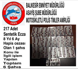 Balıkesir'de motorize Yunus ekiplerinin şüphe üzerine durdurdukları bir araçtan 217 adet uyuşturucu hap çıktı. Araçta bulunan 6 kişi gözaltına alındı. Edinilen bilgiye göre, Balıkesir İl Emniyet Müdürlüğüne bağlı motorize Yunus timleri uygulama sırasında durumundan şüphelendikleri ve içerisinde 6 kişinin bulunduğu aracı durdurdu. Ekipler araçta yaptıkları aramalarda 217 adet uyuşturucu hap ele geçirdi. Yapılan GBT sorgusunda S.G. isimli şahsın uyuşturucu ticareti yapma suçundan 8 yıl 6 ay kesinleşmiş hapis cezası ve aynı suçtan bin 660 TL. para cezası olduğunun anlaşılması üzerine, gerekli işlemler için araçta bulunan diğer 5 kişi ile birlikte Narkotik Suçlarla Mücadele Şube Müdürlüğüne teslim edildi. (İHA)