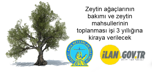 Devlet Hava Meydanları İşletmesi Balıkesir Koca Seyit Havalimanı Müdürlüğü tarafından; Balıkesir Koca Seyit Havalimanı sınırları içerisinde bulunan 1058 adet zeytin ağacının bakımı ve ürünlerin toplanması işi KDV dâhil yıllık 25.000.-TL/Yıl (yirmibeşbinTL) muhammen kira bedeli üzerinden açık ihale usulü ile ihale edilerek 3 (üç) yıllığına kiraya verilecektir. Detaylı bilgi için tıklayınız
