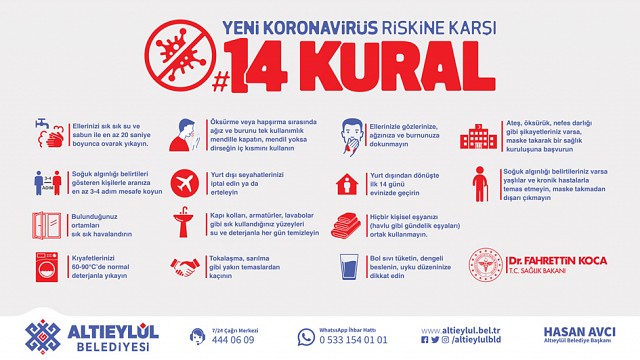 Altıeylül Belediyesi tarafından yapılan basın açıklamasında şöyle denildi: Tedbirli ve temkinli olmakta fayda var. Sağlık Bakanlığı ve İçişleri Bakanlığı tarafından yapılan açıklamalara uyalım. LÜTFEN, Koronavirüs Riskinden Korunmak İçin 14 Kuralı PAYLAŞALIM, Koronavirüsün yayılmasını önleyelim. #evdekalTürkiye #coranatürkiye Haber: Aydın DEMİRKAYA