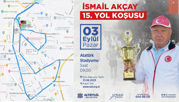 15. İSMAİL AKÇAY YOL KOŞUSU için geri sayım başladı. Meksika 1968 Olimpiyatları'nda maraton dördüncüsü olarak Türk atletizm tarihine geçen milli atlet Balıkesir’in yaşayan efsanesi İsmail Akçay adına Altıeylül Belediyesi tarafından 15.'sİ düzenlenen yol koşusu 3 Eylül Pazar günü Atatürk Stadyumu’nda saat 09.00’da başlayacak. İsmail Akçay 15. Yol Koşusuna Tüm Balıkesirliler davetlidir. YOL KOŞUSU GÜZERGAHI: