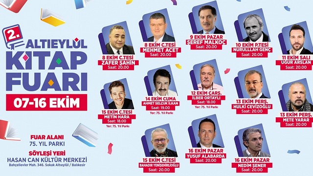 Altıeylül Belediyesi’nin 2’ncisini düzenleyeceği Altıeylül Kitap Fuarı, 7-16 Ekim tarihleri arasında 75’inci Yıl Parkı’nda birbirinden değerli yazarlar ve on binlerce kitap ile birlikte kitapseverlerle buluşuyor.