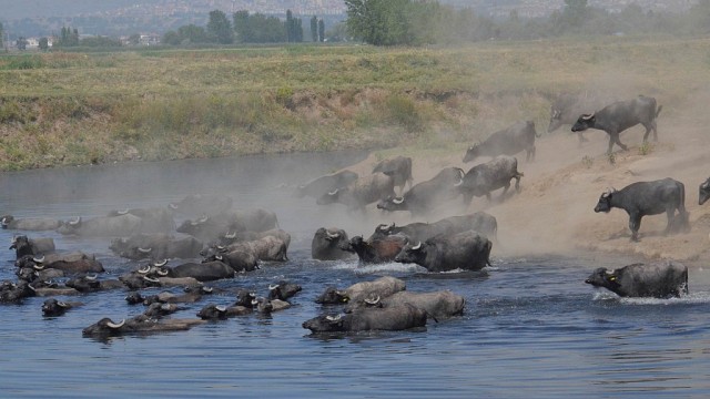 Sıcak havaların tavan yaptığı Balıkesir'de manda sürüleri günün yarısını suyun içinde geçiriyor. Mevsim normallerinde bir saat suda kalan mandalar 40 dereceyi aşan sıcaklıklarda sudan çıkmıyor. Kaymağı ile ünlü Balıkesir'de manda sürüleri de sıcak havayla mücadele ediyor. Mandacılığın yapıldığı Altıeylül ilçesine bağlı Yakupköy kırsalında sabah erken saatlerde beslenen mandalar, sıcak havada uzun süre suda kalarak serinliyor. Yaklaşık 300 mandanın suya koşma anı Afrika'da çekilen belgesel görüntülerini aratmazken, hayvanlar sıcağın etkisinden suda kalarak korunuyor. Bindiği atı ile hayvanlara bekçilik yapan Mehmet Dinçer, "Mandanın özelliği zaten suda durmasıdır. Suya girerler ve sıcak havada gün boyu suyun içinde kalırlar. Akşam saatlerinde de sudan çıkarak etrafa yayılırlar" dedi. Manda sürüsünün sahibi ve aynı zamanda Balıkesir Manda Yetiştiricileri Birliği Başkan Yardımcısı Ali Çırpıcı, "Bu mandaların ter bezi olmuyor ve serinlemek için suya ihtiyaç duyuyorlar. Özellikle böyle sıcak havalarda hayvanın derisinin siyah olması dolayısı ile suda uzun zaman geçiriyorlar. Sıcak havalarda saat 11'den 4'e kadar suyun içinde kalıyorlar ardından da yaylıma çıkıyorlar" şeklinde konuştu. Manda sürüsünün suyun içindeki görüntüleri belgesel görüntülerini aratmadı. (İHA)