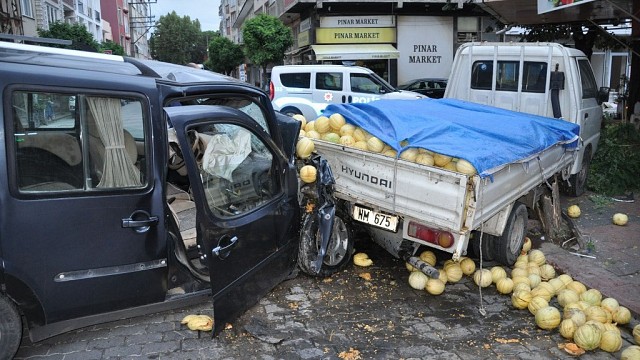 Balıkesir'de alkollü sürücünün kullandığı araç, park halindeki kavun yüklü kamyonete çarptı. Edinilen bilgiye göre, Gönen ilçesi Balya Caddesi üzerinde park halinde bulunan 10 NM 675 plakalı kamyonete iddiaya göre süratle gelen 35 AR 9389 plakalı araç çarptı. Çarpmanın şiddeti ile yaklaşık 10 metre sürüklenen kamyonet, bir ağaca ve ardından durak tabelasına çarparak durabildi. Araçta olmayan Mustafa Dirlik kazadan kurtulurken, yaralanan M.Ö. isimli sürücü ise hastaneye kaldırıldı. Gönen Devlet Hastanesine kaldırılan sürücünün hayati tehlikesinin olmadığı ve yapılan muayenesinde aşırı alkollü olduğunun belirlendiği ifade edildi. Araç içerisinde de çok sayıda bira şişesi bulundu. Kaza ile ilgili soruşturma başlatıldı. (İHA)