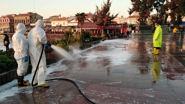 Ayvalık ilçesinde belediye ekipleri; korona virüsün etkisini arttırdığı bu günlerde çalışmalarını yoğunlaştırdı. Büyükşehir Belediyesine Bağlı Ayvalık İtfaiye ekipleri ile beraber geçtiğimiz günlerde Ayvalık’ın her yeri dezenfekte edildi. Ayvalık ilçesinde belediye ekipleri ve İtfaiyeciler ; korona virüsün etkisini arttırdığı bu günlerde çalışmalarını yoğunlaştırdı Ayvalık sokakları, meydanlar ve kordon dezenfekte edildi. Belediye ekipleri sabaha kadar süren çalışma ile ilçenin tüm noktalarını dezenfekte ettiler. Ayvalık Belediyesi Mart ayından bu yana dezenfeksiyon işlemlerine hiç aralık vermeden devam ettiğini dile getiren Temizlik İşleri Yetkilileri; Ayvalık’ta yıkanmadık hiçbir yeri bırakmadıklarını dile getirdiler. Korona virüs Covit-19’a yakalanan ve görevini evinden yürütmek zorunda kalan Ayvalık Belediye Başkanı Mesut Ergin, çalışmaların aralıksız devam edeceğini bildirdi. Ayvalık Belediyesi Temizlik İşleri Şefi Mustafa Akkuzu, Belediye Başkanı Mesut Ergin'in emirlerini yerine getirdiklerini ve Mart ayından bu yana başlattıkları hummalı çalışmaların son günlerde artan Covid19 vakaları nedeniyle daha da sıklaştırıldığını dile getirdi. Ayvalık’ta 16 kırsal mahallede dezenfeksiyon çalışmalarının devam ettiğinin altını çizen yetkililer, 20 personel, 10 araçla 7/24 çalıştıklarını belirtti. Ayvalık’ta cadde, sokak, çocuk parkları, otobüs durakları başta olmak üzere ilçemizin dört bir yanını temizlediklerini dile getiren Ayvalık Belediye Başkanı Mesur Ergin; Çevre ve Şehircilik Bakanlığı'nın da onayladığı tonlarca su bazlı ilaçla Ayvalık’ı baştan sona dezenfekte ettiklerini söyledi.