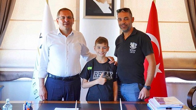 Dünya Şampiyonası’na hazırlanan Ayvalık’ın gururu 11 yaşındaki minik motosiklet sporcumuz Çağatay Çoklar geçtiğimiz günlerde Ayvalık Belediye Başkanı Mesut Ergin’i makamında ziyaret etti. Ziyaretle ilgili bir paylaşım yapan Ayvalık Belediye Başkanı Mesut Ergin, “Dünya Şampiyonası’na hazırlanan Ayvalık’ın gururu 11 yaşındaki minik motosiklet sporcumuz Çağatay Çoklar bizleri makamımızda ziyaret etti. Afyonkarahisar’da, 1-2 Eylül tarihlerinde Dünya Şampiyonası’nda yarışacak Türkiye’den 5 sporcu arasında olan minik hemşehrimize başarılar diliyorum.” Dedi.