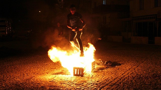 Hıdırellez ateşine düşerek yandı Ayvalık ilçesinde, Hıdırellez gecesinde polis ve itfaiye ilçe genelindeki mahalle ve sokaklarda gençlerin yaktıkları dev ateşler nedeniyle ciddi yoğunluk yaşadı. İlçede merkez mahalleleri başta olmak üzere Yenimahalle, 150 Evler, Aliçetinkaya, Altınova, Küçükköy’de bir Hıdırellez geleneği olan dilekler dileyerek ateşten atlamak isteyen mahalle sakinleri bu geleneği yakılan ateşlerle gerçekleştirdi. Ancak bazı gençler yakılan ateşlere eski kamyon ve otomobil lastikleri atınca büyüyen alevler kontrolden çıkınca, olası bir yangına karşı İlçe Emniyet Müdürlüğü bünyesindeki polis ekipleriyle Balıkesir Büyükşehir Belediyesi İtfaiye Daire Başkanlığı’na bağlı Ayvalı İtfaiye Grup Amirliği müdahale etti. Bazı cadde ve sokaklardaki gençler ise itfaiyenin söndürdüğü ateşi defalarca kez daha yeniden tutuşturarak itfaiye ve polis ekiplerine zor anlar yaşattı. 150 Evler Mahallesi’nde Gençlik Hizmetleri İlçe Spor Müdürlüğü bünyesindeki Kapalı Spor Salonu önünde dev ateşler yakan gençlerin ise itfaiyenin söndürdüğü ateşi 4 kez ve her defasında daha da büyüğünü yaktığı gözlendi. 13 yaşındaki bir çocuk ateşin içine düşerek yandı Öte yandan Ayvalık’ta Hıdırellez gecesi nedeniyle ilçenin en büyük mahallesi Altınova’da ismi öğrenilemeyen 13 yaşındaki bir çocuk ateşten atlarken bacağının alevler arasındaki odunlara takılması sonucunda ateşin içine düştü. Vücudunun çeşitli yerlerinde ciddi yanıklar oluşan çocuk 112 Acil Yardım Ambulansı ile Ayvalık Devlet Hastanesi’ne kaldırıldı. Hastanede yapılan ilk müdahalenin ardından talihsiz çocuğun İzmir Ege Üniversitesi’ne sevk edildiği öğrenildi. (İHA)