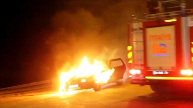 Balıkesir’in Ayvalık ilçesi Altınova’da seyir halindeki bir otomobil cayır cayır yandı. Alınan bilgiye göre; Çanakkale ile İzmir’i birbirine bağlayan E-87 karayolunun Altınova girişinde saat 19.45 sıralarında Ali Rıza Geçiner idaresindeki 17 KF 919 plakalı özel aracın, İzmir istikametine seyir halindeyken birden motor aksamından dumanlar yükselmeye başladı. Alevler arasında kalan aracın sürücüsü Geçiner ile araç içindekiler kendi çabalarıyla araçtan çıkmayı başardı. Balıkesir Büyükşehir Belediyesi İtfaiye Daire Başkanlığı bünyesindeki Ayvalık İtfaiye Grup Amirliği’ne bağlı ekipler olay yerine kısa sürede ulaşarak aracı söndürmesine rağmen araç kullanılmaz hale geldi. Yangının ardından, araç sahibi Ali Rıza Geçiner haberi görüntülemeye çalışan gazetecileri taş yağmuruna tuttu.. Yangınla ilgili soruşturma sürüyor. (İHA)