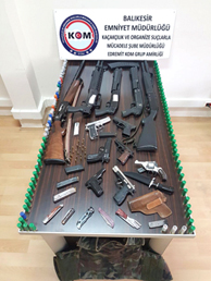 Balıkesir ve Edremit Kaçakçılık ve Organize Suçlarla Mücadele (KOM) Grup Amirliklerinin ortaklaşa çalışması ile Edremit Körfezi'nde halk üzerinde korku, tehdit, baskı uygulamak suretiyle kendilerine menfaat temin eden suç örgütü çökertildi. Çalışmalarda 24 kişi gözaltına alındı. Edinilen bilgiye göre, Balıkesir KOM Şube Müdürlüğü ve Edremit KOM Grup Amirliğince Edremit ilçesi başta olmak üzere çevre il ve ilçelerde halk üzerinde korku, tehdit, baskı uygulamak suretiyle kendilerine menfaat temin eden suç örgütünün deşifre edilip tüm unsurlarıyla birlikte yok edilmesi için çalışma başlatıldı. Suç ve suç unsurlarının ele geçirilmesi amacıyla Edremit Cumhuriyet Başsavcılığı koordinesinde başlatılan soruşturmada, suç örgütünün "ölümle tehdit, silah kaçakçılığı, göçmen kaçakçılığı, uyuşturucu madde ticareti, kasten yaralama, kişi hürriyetinden yoksun bırakma, nitelikli yağma, rüşvet" gibi 53 ayrı eylemde bulundukları tespit edildi. 30 şüphelinin yakalanması için Balıkesir, İstanbul, Trabzon illerinde toplam 27 adrese baskın yapıldı. Şüphelilerden organize suç örgütü lideri ile birlikte 24 kişi gözaltına alındı. Şüphelilere ait ikametlerde yapılan aramalarda 2 adet ruhsatsız silah, 3 adet av tüfeği, 5 adet dolu kartuş, 6 adet 9 mm çağında fişek ele geçirildi. 6 firari şüphelinin yakalanması için çalışmalar devam ederken, Balıkesir Emniyet Müdürlüğü suç ve suçlu ile mücadele konusunda kararlılığın artarak devam edeceğini açıkladı. (İHA)