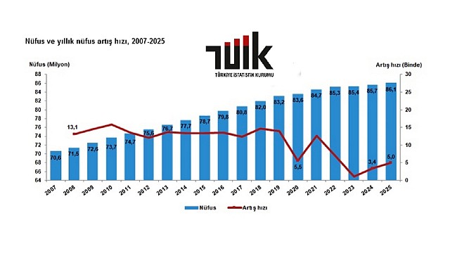 TÜİK’ten denilen bilgiye göre; “Türkiye nüfusu 86 milyon 92 bin 168 kişi oldu. Balıkesir nüfusu 1 milyon 284 bin 517 kişi oldu. Çanakkale nüfusu 573 bin 976 kişi oldu. Adrese Dayalı Nüfus Kayıt Sistemi Sonuçları, 2025 Türkiye'de ikamet eden nüfus, 31 Aralık 2025 tarihi itibarıyla bir önceki yıla göre 427 bin 224 kişi artarak 86 milyon 92 bin 168 kişi oldu. Erkek nüfus 43 milyon 59 bin 434 kişi olurken, kadın nüfus 43 milyon 32 bin 734 kişi oldu. Diğer bir ifadeyle toplam nüfusun %50,02'sini erkekler, %49,98'ini ise kadınlar oluşturdu. Adrese Dayalı Nüfus Kayıt Sistemi (ADNKS) sonuçlarına göre, ülkemizde ikamet eden yabancı nüfus(1) bir önceki yıla göre 38 bin 968 kişi artarak 1 milyon 519 bin 515 kişi oldu. Bu nüfusun %49,3'ünü erkekler, %50,7'sini kadınlar oluşturdu. Nüfus artış hızı binde 5 oldu Yıllık nüfus artış hızı 2024 yılında binde 3,4 iken, 2025 yılında binde 5 oldu. İl ve ilçe merkezlerinde yaşayanların oranı %93,6 oldu Türkiye'de 2024 yılında %93,4 olan il ve ilçe merkezlerinde yaşayanların oranı, 2025 yılında %93,6 oldu. Diğer yandan belde ve köylerde yaşayanların oranı %6,6'dan %6,4'e düştü. Nüfusumuzun %67,5'ini yoğun kent olarak sınıflandırılan yerlerde ikamet edenler oluşturdu Mekânsal Adres Kayıt Sistemi'nin (MAKS) kullanılmaya başlanması ile birlikte fiili kent-kır yapısını daha doğru yansıtan, "yoğun kent, orta yoğun kent ve kır"(2) ayrımında oluşturulan yeni bir sınıflama yapılmıştır. Bu sınıflamaya göre, Türkiye nüfusunun %67,5'inin yoğun kent, %15,8'inin orta yoğun kent ve %16,8'inin ise kır olarak sınıflandırılan yerleşim yerlerinde yaşadığı görüldü. Türkiye'de 33 ilin nüfusu azaldı Ülkemizde 2024 yılında bir önceki yıla göre 40 ilin nüfusunda azalma görülürken, 2025 yılında 33 ilin nüfusunun azaldığı görüldü. İstanbul'un nüfusu 15 milyon 754 bin 53 kişi oldu İstanbul'un nüfusu, bir önceki yıla göre 52 bin 451 kişi artarak 15 milyon 754 bin 53 kişi oldu. Türkiye nüfusunun %18,3'ünün ikamet ettiği İstanbul'u, 5 milyon 910 bin 320 kişi ile Ankara, 4 milyon 504 bin 185 kişi ile İzmir, 3 milyon 263 bin 11 kişi ile Bursa ve 2 milyon 777 bin 677 kişi ile Antalya izledi. Nüfusu en az olan il 82 bin 836 kişi ile Bayburt oldu Bayburt, 82 bin 836 kişi ile en az nüfusa sahip olan il oldu. Bayburt'u, 85 bin 83 kişi ile Tunceli, 90 bin 392 kişi ile Ardahan, 138 bin 807 kişi ile Gümüşhane ve 157 bin 363 kişi ile Kilis takip etti. Türkiye'de nüfusu 1 milyonu aşan ilk ilçe Esenyurt oldu İlçelere göre nüfus dağılımı incelendiğinde, İstanbul ili Esenyurt ilçesinin 1 milyon 3 bin 905 kişi ile ilk sırada yer aldığı görüldü. Buna göre Türkiye'de ilk defa bir ilçenin nüfusu 1 milyonu geçmiş oldu. Esenyurt İlçesini sırasıyla 957 bin 792 kişi ile Gaziantep ili Şahinbey ilçesi, 952 bin 198 kişi ile Ankara ili Çankaya ilçesi, 931 bin 722 kişi ile Ankara ili Keçiören ilçesi ve 905 bin 880 kişi ile Gaziantep ili Şehitkamil ilçesi takip etti. Nüfus piramidindeki yapısal değişim devam etti Nüfus piramitleri, nüfusun yaş ve cinsiyet yapısında meydana gelen değişimi gösteren grafikler olarak tanımlanmaktadır. Türkiye'nin 2007 ve 2025 yılı nüfus piramitleri karşılaştırıldığında, doğurganlık ve ölümlülük hızlarındaki azalmaya bağlı olarak, yaşlı nüfusun arttığı ve ortanca yaşın yükseldiği görülmektedir. Türkiye nüfusunun ortanca yaşı 34,9'a yükseldi Ortanca yaş, nüfusu oluşturan kişilerin yaşları yeni doğan bebekten en yaşlıya doğru sıralandığında ortada kalan kişinin yaşıdır. Ortanca yaş aynı zamanda nüfusun yaş yapısının yorumlanmasında kullanılan önemli göstergelerden biridir.Türkiye'de 2024 yılında 34,4 olan ortanca yaş, 2025 yılında 34,9'a yükseldi. Cinsiyete göre incelendiğinde, ortanca yaşın erkeklerde 33,7'den 34,2'ye, kadınlarda ise 35,2'den 35,7'ye yükseldiği görüldü. Ortanca yaşı en yüksek olan il Sinop, en düşük olan il Şanlıurfa oldu Ortanca yaşın illere göre dağılımına bakıldığında, Sinop'un 44 ile en yüksek ortanca yaş değerine sahip il olduğu görüldü. Sinop'u, 43,5 ile Giresun ve 43,3 ile Kastamonu izledi. Diğer yandan 21,8 ile Şanlıurfa en düşük ortanca yaşa sahip il oldu. Şanlıurfa'yı, 23,3 ile Şırnak ve 25 ile Siirt takip etti. Kadınlarda ve erkeklerde en yüksek ortanca yaşa sahip il Sinop oldu Ortanca yaşın illere ve cinsiyete göre dağılımı incelendiğinde, erkeklerde 43 ile Sinop en yüksek ortanca yaşa sahip olan il olurken, 21,3 ile Şanlıurfa en düşük ortanca yaşa sahip olan il oldu. Kadınlarda 44,9 ile Sinop yine en yüksek ortanca yaş değerine sahip olan il olurken, Şanlıurfa 22,3 ile en düşük ortanca yaş değerine sahip olan il oldu. Hiç evlenmeyenlerin oranının erkeklerde daha yüksek olduğu görüldü Ülkemizde 2009 ve 2025 yılı cinsiyete göre medeni durumun dağılımı incelendiğinde, erkeklerde hiç evlenmeyenlerin oranının kadınlara göre daha yüksek olduğu, kadınlarda ise eşi ölenlerin ve boşananların oranının erkeklerden daha fazla olduğu görüldü. Diğer yandan büyük çoğunluğu oluşturan evlilerin oranının 2009 ve 2025 yılında her iki cinsiyette de birbirine yakın oranlarda olduğu görüldü. Çalışma çağındaki nüfusun oranı %68,5 oldu Çalışma çağı olarak tanımlanan 15-64 yaş grubundaki nüfusun oranı, 2007 yılında %66,5 iken 2025 yılında %68,5 oldu. Diğer yandan çocuk yaş grubu olarak tanımlanan 0-14 yaş grubundaki nüfusun oranı %26,4'ten %20,4'e gerilerken, 65 ve daha yukarı yaştaki nüfusun oranı ise %7,1'den %11,1'e yükseldi. Toplam yaş bağımlılık oranı azaldı Çalışma çağındaki birey başına düşen çocuk ve yaşlı birey sayısını gösteren toplam yaş bağımlılık oranı, 2