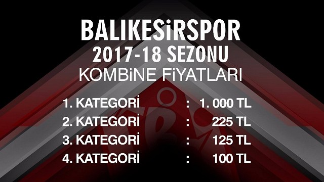 TFF. Lig takımlarından Balıkesirspor'un 2017-2018 futbol sezonunda iç sahada oynayacağı maçlara ait kombine bilet ücretleri belli oldu. 1. kategori kombine ücreti bin lira olurken, 4.kategori kombine bilet ücreti 100 TL olarak belirlendi. Balıkesirspor'un sahasında TFF 1. Lig ve Ziraat Türkiye Kupasında oynayacağı maçlara ait kombine bilet ücretleri belli oldu. Balıkesirspor resmi sitesinden yapılan açıklama ile 1. kategori kombine bilet bedeli bin liradan satışa çıkarken, bu kategoriden kombine bilet alan taraftarlara Balıkesirspor forması ve 50. yıl kitabı hediye edilecek. 2. kategori kapalı tribün kombine biletleri 225 liradan, 3. kategori maraton tribün kombine biletleri 125 liradan, 4. kategori kale arkası kombine biletleri 100 TL'den satışa çıkarıldı. Kombine bilet satın alan taraftarların vizeleme ücretleri Balıkesirspor Kulübü tarafından ödenecek. Satışa çıkan kombine biletlerini kredi kartı ile alacak taraftarlara vade farklı 6 taksit uygulanacağı öğrenildi. (İHA)