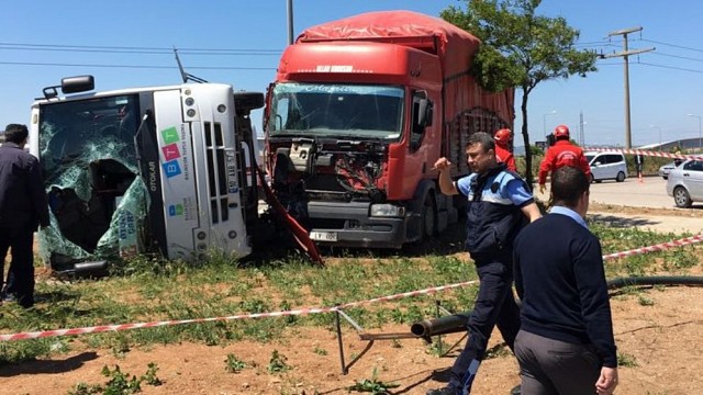 Balıkesir’in Bandırma ilçesinde yolcu minibüsü, kamyonla çarpıştı. Kazada ilk belirlemelere göre 19 kişi yaralandı. Edinilen bilgilere göre, Balıkesir’in Bandırma ilçesinde öğle saatlerinde 10 AAB 57 plakalı yolcu minibüsü, karşı yönden gelen 22 LV 002 plakalı kamyonla çarpıştı. Kazada ilk belirlemelere göre 19 kişi yaralandı. Olay yerine çok sayıda ambulans ve güvenlik ekibi sevk edilirken, yaralılar Bandırma Devlet Hastanesine kaldırıldı. Balıkesir'de yolcu minibüsünün kamyonla çarpışması Balıkesir'in Bandırma ilçesinde şehir içinde yolcu taşımacılığı yapan minibüs ile kamyon çarpıştı. Kazada 19 kişi yaralanırken, can kaybı meydana gelmemesi tek teselli oldu. Edinilen bilgiye göre, Bandırma'da Ulaşım Hizmetleri AŞ'ye bağlı Çarşı-Otogar seferini yapmakta olan 10 AAB 57 plakalı yolcu minibüsü ile 22 LV 002 plakalı H.S. idaresindeki kamyon Otogar Kavşağı'nda çarpıştı. Kaza yerinde bir anda can pazarı yaşanırken, olay yerine gelen sağlık ve itfaiye ekipleri minibüsteki 19 yolcuyu ambulanslarla Bandırma Devlet Hastanesine kaldırdı. Kaza yerine gelen Ulaşım Hizmetleri AŞ Yönetim Kurulu Başkanı Bülent Bican, İHA'ya yaptığı açıklamada, "Otogar seferini yapan aracımız kontrollü geçiş yapan polis arkadaşların nezaretinde karşıya geçerken, gelen kamyon da duramayarak bizim araca yandan vuruyor. Çok şükür can kaybı yok, 19 yaralımız var" dedi. Balıkesir İl Sağlık Müdürü Necati Kelemençe ise, Bandırma Devlet Hastanesine kaldırılan yaralıları ziyaret ederek geçmiş olsun dileklerini iletti. (İHA)
