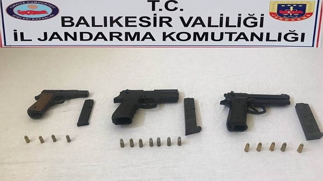Balıkesir İl Jandarma Komutanlığı ekiplerince Balıkesir’in Karesi ve Edremit ilçelerinde şüpheli 3 şahsa yapılan operasyonlarda 3 tabanca ve çok sayıda fişek ele geçirildi. Jandarma ekiplerinin Edremit'in Altınoluk Mahallesinde şüpheli hareketlerde bulunan iki kişinin yapılan üst aramasında M.F. adlı şahısın üzerinde 1 adet 9 mm çapında tabanca, 7 adet 9 mm çapında tabanca fişeği yakalandı. Arkadaşı S.K. üzerinde yapılan aramada da 1 adet 7,65 çapında tabanca ve 4 adet 7,65 çapında tabanca fişeği yakalandı. Jandarma ekiplerinin Balıkesir’in Karesi ilçesine bağlı Ortaköy Mahallesinde yaptığı operasyonda R.D. isimli şahsın üzerinden 1 adet 7,65 çapında tabanca, 3 adet 7,65 çapında tabanca fişeği ele geçirildi. Jandarmada yapılan sorgulamada şahsın "Tehdit ve Hakaret" suçundan arandığı tespit edildi. Olaylarla ilgili olarak yakalanan şüpheliler M.F, S.K. ve R.D. isimli şüpheliler hakkında adli yasal işlem başlatıldığı bildirildi. (İHA)