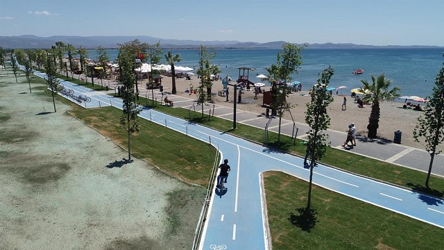 Edremit Güre sahil şeridi ve Altınkum yenilenen yüzüyle hem bölge halkının hem de turistlerin büyük beğenisini topluyor. Yemyeşil görüntüsü, yürüyüş ve bisiklet yolları, spor sahaları, parkları, modern kent mobilyalarıyla Balıkesir’e çok yakıştı. Balıkesir Büyükşehir Belediye Başkanı Yücel Yılmaz, Körfez bölgesinde alt yapı ve üst yapı çalışmalarını aralıksız sürdürüyor. Bir yandan BASKİ şebeke suyu bağlama, kanalizasyon, dere ıslahı, gibi çalışmaları sürdürürken Fen İşleri, Kent Estetiği ve Yol Yapım Bakım ve Onarım daire başkanlıkları da Körfez bölgesini adeta sil baştan yapılandırıyor. Yürüyüş ve bisiklet yollarından spor sahalarına, modern kent mobilyalarından bitki örtüsüne kadar yenilenen Altınkum ve Güre sahil bandı; hem gecesiyle hem gündüzüyle Balıkesir’e yakışır hale geldi. Yeşilin ve mavinin buluştuğu bölgede, tamamı Büyükşehir Belediyesi’nin imkanlarıyla yapılan çalışmaların şehrin turizmine de önemli katkılar sağlaması bekleniyor. GURUR DUYULAN ŞEHİR 291 kilometrelik sahil bandında benzer çalışmaların sürdüğü Balıkesir’deki projelerle ilgili açıklama yapan Balıkesir Büyükşehir Belediye Başkanı Yücel Yılmaz, “31 mavi bayrağın dalgalandığı sahillerimizi vatandaşlarımızın ve gelen misafirlerimizin ihtiyaçlarına cevap verebilecek şekilde düzenliyoruz. Balıkesir, eşsiz deniziyle temiz plajlarıyla turistlerin gözdesi haline geldi. Bu sayede geçimini turizm sektöründen kazanan esnaf ve işletmecilerde mağduriyet yaşamayarak sezonu verimli bir şekilde geçirmeye başladı. İlçe belediye başkanlarımızla beraber Balıkesir’i gurur duyulacak bir şehir haline getiriyoruz. Körfezimize gelen misafirlerimiz, yaşam kalitesi yüksek, bütçelerini zorlamadan rahatlıkla tatil yapabilecekler.