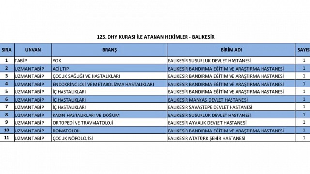 Balıkesir, sağlık alanında her geçen gün daha da güçleniyor. 125. Devlet Hizmet Yükümlülüğü Kurası kapsamında yapılan son atamalarla ilimize 10 Uzman Tabip ve 1 Tabip kazandırıldı. Böylece Balıkesir, hem şehir merkezinde hem de ilçelerde vatandaşlara daha hızlı, nitelikli ve erişilebilir sağlık hizmeti sunma olanaklarını arttırıyor.