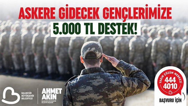 Balıkesir’de ‘Yakın Kart’ dönemini başlatan ve dar gelirli vatandaşların yanında olan Balıkesir Büyükşehir Belediye Başkanı Ahmet Akın, askere gidecek gençlere 5 bin TL destek sağlıyor. Askere gidecek gençler bu destekten yararlanmak için 1 Temmuz’a kadar başvuru yapabilecek. Halkçı belediyecilik anlayışıyla toplumun her kesimine yönelik hizmet üreten Balıkesir Büyükşehir Belediye Başkanı Ahmet Akın, askere gidecek gençlere 5 bin TL destek veriyor. Seçim vaatlerini tek tek gerçekleştiren Başkan Akın, temel askerlik görevini 6 ay yapacak gençlerin maddi yükünü hafifletiyor. Askere gidecek gençler, 1 Temmuz 2025 tarihine kadar 444 40 10 numaralı Yakın Çözüm Çağrı Merkezi üzerinden başvuru yapabilecek.