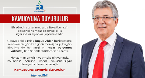 Edremit Belediye Başkanı Selman Hasan Arslan bir kamuoyu duyurusu yaptı. Başkan Arslan yaptığı duyuruda, “Bir süredir sosyal medyada belediyemizin personeline maaş ödemediği ile ilgili spekülasyonlar yapılmaktadır. Göreve geldiğimiz 3 buçuk yıldan beri personel maaşları bir gün bile gecikmemiş olup, bugün itibariyle de herhangi bir maaş borcumuz yoktur! Çıkan haberler tamamen asılsızdır. Her zaman emeğin ve emekçinin yanında, haklarının sonuna kadar savunucusuyuz olmaya da devam edeceğiz. Kamuoyuna saygıyla duyurulur.” Dedi.