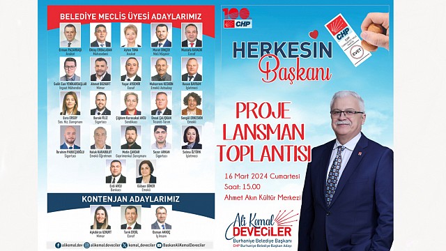 Burhaniye’nin mevcut Belediye Başkanı Ali Kemal Deveciler, tekrar aday gösterilmesi üzerine başlattığı seçim çalışmalarına Cumhuriyet Halk Parti Meclis Üye adayları tanıtımı ve yeni dönem projelerinin lansmanı ile devam edecek. Mahalle mahalle, ekibi ile gezerek yaptıklarını ve yapacaklarını anlatan Başkan Ali Kemal Deveciler hayata geçirdiği vizyon projeleri ile takdir toplamaya devam ediyor. 16 Mart Cumartesi günü Ahmet Akın Kültür Merkezi'nde saat 15.00’te “Proje Lansman Toplantısı” ile 2. Dönemi için planladıkları projeleri anlatacak olan Deveciler, yol arkadaşı olan Meclis Üyesi Adaylarını da lansmanda seçmene tanıtacak. İddialı kadrosu ve projeleri ile bir dönem için daha seçmenden destek isteyen Ali Kemal Deveciler’in; eğitimden sağlığa, sosyal belediyecilikten, hizmet belediyeciliğine 5 yıldır Burhaniye’de yaptıkları yapacaklarının teminatı olarak görülüyor.