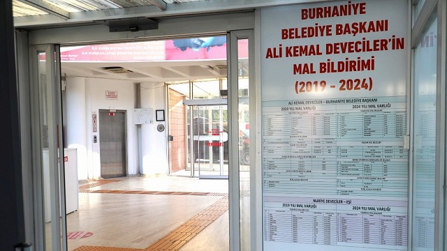 31 Mart Yerel Seçimlerinde Burhaniyeliler tarafından bir dönem daha belediye başkanlık görevine seçilen Burhaniye Belediye Başkanı Ali Kemal Deveciler, 2019 ve 2024 yıllarına ait mal beyanını belediye hizmet binasının giriş kapısına astı. Şeffaf belediyecilik anlayışı ile ilçeyi beş yıldır üstün bir başarı ile yöneten Başkan Deveciler konuşmalarında sıksık vurguladığı "Burhaniye'de tüyü bitmemiş yetimin hakkını kimseye yedirmem" anlayışıyla başkanlığını sürdüreceğini bir kez daha kanıtladı. Eşi ve kendisine ait mal bildirimini içeren detaylı tabloda 2019 ve 2024 yıllarına ait mal varlığı kalem kalem tabloya dökülerek Burhaniye halkının bilgisine sunuldu.