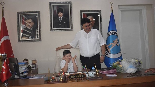 Özel Eğitim ve Rehabilitasyon Merkezin de eğitim gören 9 yaşındaki Yiğit Kozan babası İsmail Kozan ile birlikte Havran Belediye Başkanı Emin Ersoy'u makamında ziyaret etti. Baba İsmail Kozan, “Yiğit, Belediye Başkanımız Sayın Emin Ersoy'u çok seviyor bugün ısrarla Başkanımız görmek istediği söyledi. Başkanımız sağolsun yoğun iş temposunda bizlere vakit ayırarak ilgilendi.” diyerek Başkan Emin Ersoy'a teşekkür etti. Havran Belediye Başkanı Emin Ersoy makam koltuğuna kısa süreliğine Küçük Yiğit'e oturttu. Başkan Ersoy, Yiğit gibi özel çocuklarımıza ve vatandaşlarımıza her zaman ayrı bir önem verdiğini ifade ederek, “Engelli vatandaşlarımızın yaşamlarını kolaylaştırmak için tüm kaldırımlarımıza engellilerin kullanabileceği rampalar oluşturduk. Onları sosyal hayata dahil etmek için projelerimizde muhakkak engelli vatandaşlarımızı da düşünerek hareket ediyoruz.” dedi.