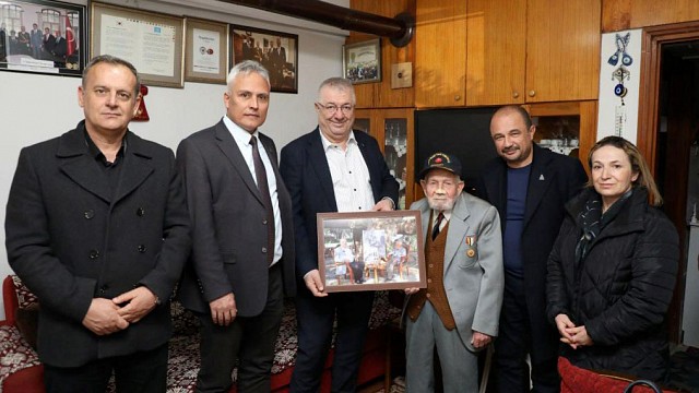 Edremit Belediye Başkanı Mehmet Ertaş, Başkan Yardımcısı Coşkun Taşkın ve Meclis Üyeleriyle birlikte Ulu Önder Mustafa Kemal Atatürk'ü görme şerefine erişen Kore Gazimiz Ahmet Şükrü Yormaz'ı, evinde ziyaret ederek elini öptüler. Edremit Belediye Başkanı Mehmet Ertaş konuyla ilgili olarak yaptığı paylaşımda, “Ulu Önderimiz Mustafa Kemal Atatürk'ü görme şerefine erişen Kore Gazisi Ahmet Şükrü Yormaz'ı, Yardımcım Coşkun Taşkın ve meclis üyesi arkadaşlarımla birlikte evinde ziyaret ettik. Ordu Donatım Birliği'nde 26 yıl top tamircisi olarak çalışan Ahmet amcanın elini öpüp onun için özel hazırladığımız hediyeyi kendisine takdim ettik, geçmişe dair hasbihal ettik. Bizi evinde konuk eden kıymetli Ahmet amcamıza teşekkür ediyor, sağlıklı uzun ömürler diliyorum. Sizlere minnettarız. İyi ki varsınız.” Dedi. Haber: Hasan AKAR