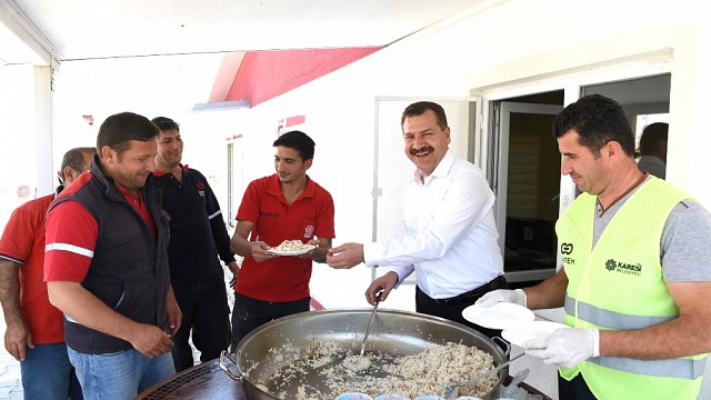 Saha personelleri ile geçtiğimiz günlerde kahvaltıda buluşan Karesi Belediye Başkanı Yücel Yılmaz, dün de öğle yemeğinde bir araya gelerek yoğun sezon öncesi personeli motive ediyor.Havaların saha çalışmalarına elverişli hale gelmesi ile birlikte sezon açılışını gerçekleştiren Karesi Belediye Başkanı Yücel Yılmaz personelini yalnız bırakmıyor. Geçtiğimiz günlerde sabah kahvaltısı ile personelle bir araya gelen Başkan Yılmaz dün de Karesi Kaymakamı Abdulakdir Demir'in de katılımı ile şantiyede öğle yemeğinde buluştu. Personeline kavurmalı pilav ikram eden Başkan Yılmaz, bu sezonun yoğun geçeceğini söyledi. Başkan Yılmaz şantiye hakkında Kaymakam Demir'e bilgiler verdi. Şantiyede personeli selamlayan Kaymakam Demir, "Ben her yerde sizleri görüyorum. Çalışmalarınızı yakından takip ediyorum, hepinizi kutluyorum" dedi. Karesi Belediyesi Fen İşleri Müdürlüğü ekipleri, geçtiğimiz günlerde kazasız belasız bir çalışma dönemi geçirmek için Karesi Belediye Başkanı Yücel Yılmaz'ın da katıldığı bir törenle kurban kesip dualar ederek başlangıcı yaptı. Öğlen yemeğinde personelle yeniden bir araya gelen Yılmaz, "İşçilerimiz çalışma döneminin kazasız belasız geçmesi için kurban kestiler. Bizde onları bu önemli günde yalnız bırakmak istemedik. Fen İşleri, Temizlik İşleri ve Park Bahçeler Müdürlüğü çalışanlarımız işlerini büyük bir özveri ile zaten yapıyorlar. Kendilerine bu dönemde kazasız belasız, hayırlı bir dönem geçirmelerini diliyoruz. Karesi'de her caddeye her sokağa hizmet götürüyoruz. Planlı bir şekilde çalışmalarımızı yürütüyoruz. Vatandaşlarımızı çamur ve çukur derdinden kurtarmak için daha çok çalışmalıyız" dedi.