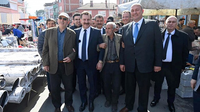 Balıkesir Büyükşehir Belediye Başkanı Yücel Yılmaz’ı ve AK Parti Bigadiç Belediye Başkan adayı Mustafa Göksel’i Bigadiçli’ler büyük bir sevgiyle karşıladı. Başkan Yılmaz, “Maşallah Bigadiç kararını vermiş. 31 Mart zaferine Bigadiçle beraber yürüyoruz” dedi. Balıkesir Büyükşehir Belediye Başkanı Yücel Yılmaz, AK Parti Bigadiç Belediye Başkan adayı Mustafa Göksel ile birlikte 31 Mart seçimleri için Bigadiçli’lerden destek istedi. Bigadiç Ziraat Odası, Et ve Süt Birliği, Esnaf ve Sanatkarlar Kooperatifi, Esnaf Kefalet Kooparatifi, Şoförler Odası’nı ziyaret eden Başkan Yılmaz, pazar yerinde vatandaşlarla bir araya geldi. Bigadiç Sanayi esnafını ve Bigadiç Belediye Mezbahası’nda çalışanlara kolaylıklar dileyen Başkan Yılmaz, Babaköy ve Hamidiye mahallelerinde büyüklerinin elini öpüp “31 Mart’ta zafere beraber yürüyelim” dedi.